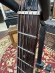 -The frets have some wear, but the wear is fairly even and the guitar doesn't have any dead spots or significant fret issues. As it sits, strung up with the vibrola, the low E doesn't have much of a break angle, resulting in some buzzing.